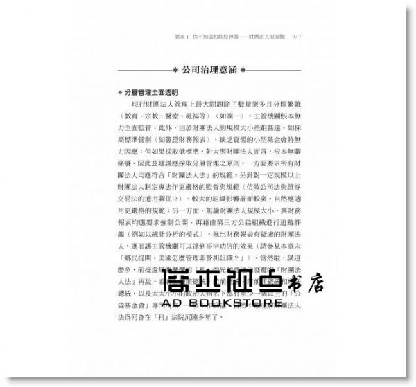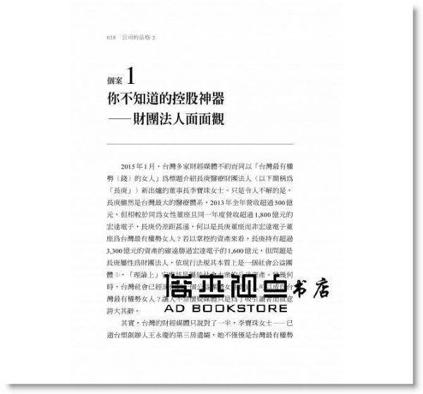 最後,在本文篇幅失控前還是簡單談一下本書特色,本書延續前一本《公司的品格》模式,同樣以台灣本地實際發生而且還存活的公司案例來探討台灣公司治理問題及提供相關建議。相較於上本書,除了以不同公司個案討論不同議題外,本書約略不同之處有二: 第一,本書多加了一些「美國是怎樣處理這類問題?」的鄉民提問。這是因為我發覺台灣很多名嘴和民代很擅長「點出問題」後拚命幹譙,然後……就算了!大家都罵的很爽卻沒人願意談問題解決之道,例如之前照三餐罵的慈濟財報事件就是如此。請問台灣有類似問題的財團法人只有慈濟嗎? 事情過了一年多,針對這類問題台灣又改變了什麼?或者這一切就只是成就某些名嘴的「公平正義」形象?如果我們期望台灣有所進步,要改變的是慈濟的財報? 還是應該建立一套完整的制度來規範所有(或重要)的財團法人?我不是財團法人專家,我也不想假裝是這類專家,但至少我能做的就是告訴你美國是怎麼處理這類問題的,希望對於只會攻擊個案而不求從制度面解決問題的台灣能有所幫助。