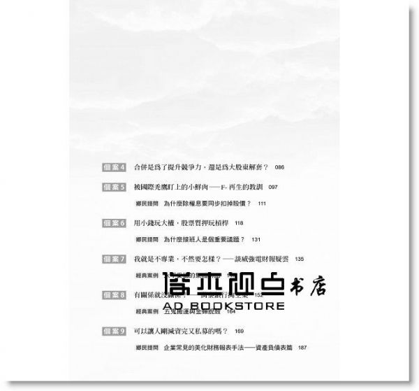 ◎ 你不知道的控股神器──財團法人面面觀 ◎ 怎麼了?你變了!說好的接班呢?──不同的家族控股模式 ◎ Treat or Trick?──不給糖就搗蛋的股東會 ◎ 我就是不專業,不然要怎樣?──談威強電財報疑雲 ◎ 有關係就沒關係?──萬泰銀行掏空案 ◎ 可以讓人剛減資完又私募的嗎?──企業常見的美化財報手法 ◎ 進軍國際的黃粱一夢──歌林啟示錄 ◎ 你好胖,我好怕──基因國際的現代金錢啟示錄