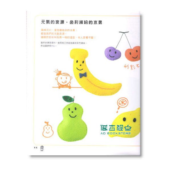 材料为不织布,做法超简单!马上就能动手做,附实物大小的纸型让我来介绍一下用不织布缝出来的朋友们吧!女孩、男孩、娃娃、动物、恐龙……都是我最喜欢的玩伴,还有蛋糕、点心、水果、花朵……都是一些令我爱不释手,将四季妆点得色彩缤纷的小东西。