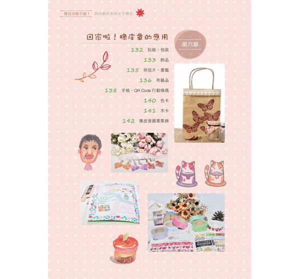 ■ 特別收錄橡皮章的延伸應用示範(飾品、包裝、貼紙、書籤、明信片、布藝品、手帳),讓還不知道該怎麼「玩」橡皮章的你,也能跟著做出各種具有個人風格的特色小物。